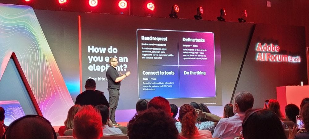 Fui em um evento da Adobe semana passada sobre Inteligência Artificial, e como meu compromisso é sempre falar sobre todos os eventos que eu vou (me chamem pra eventos!), vou destacar aqui 3 pontos fundamentais sobre o uso de IA na rotina que Jeff Canada, Marketing Lead da OpenAI, levou para sua apresentação: