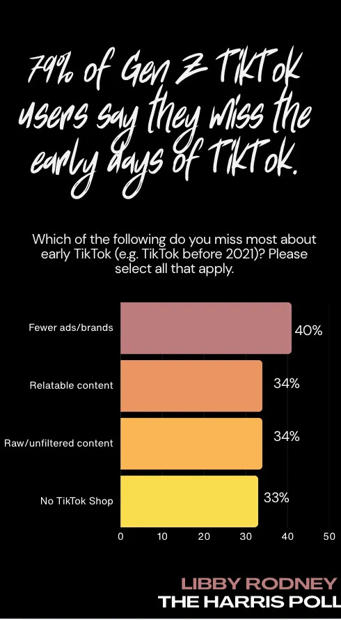 Uma pesquisa da Harris Poll nos EUA revelou que a Geração Z já está nostálgica com o TikTok (que existe há apenas 6 anos). Nos resultados, 73% dos Gen Z ativos do app acham que os conteúdos parecem muito performáticos, enquanto 53% deles acham que o app tem sido muito censurado. De todos, 79% tem saudades do TikTok dos tempos de 2020.