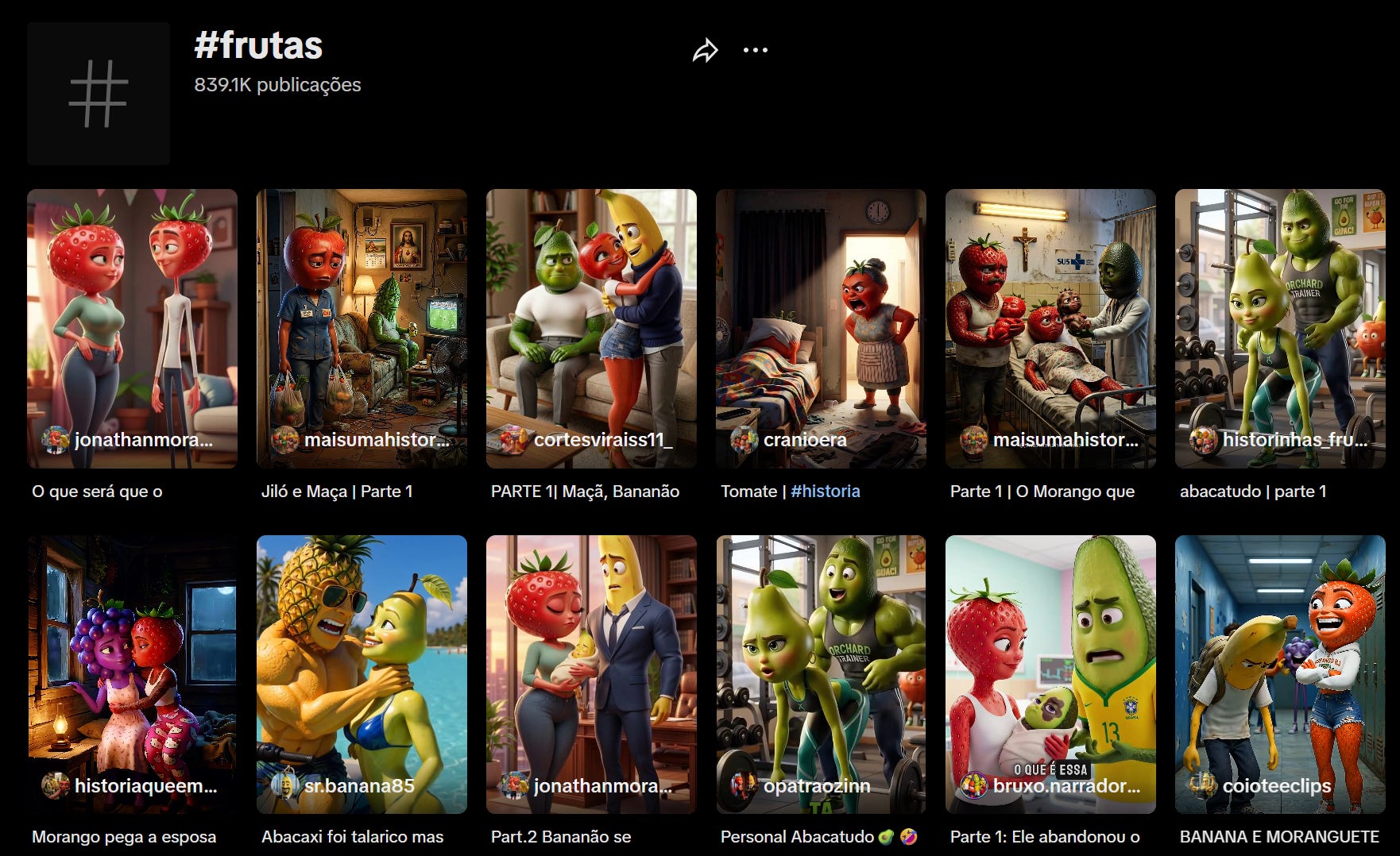 No TikTok, a tag #frutas já acumula mais de 838 mil vídeos publicados, todos feitos com IA e com estilo 100% PT-BR, tanto nos enredos quanto nos personagens (muitos deles pouquíssimo recomendados para crianças). O movimento realmente já tomou uma grande camada da plataforma e é interessante notar como fomentou uma exploração por parte de alguns perfis de creators.